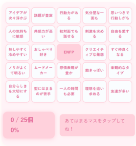 mbti-enfp-bingo 2025.07.19 今すぐMBTI性格診断する 今すぐ色分け診断する 今すぐ動物診断する 今すぐビンゴ診断する タイプ別あるある診断(16タイプ) 今すぐキャラクターコード診断 全タイプ一覧を見る 今すぐ64タイプ診断をする(無料) 全64タイプ一覧を見る 今すぐラブタイプ診断 ラブタイプ全16タイプ一覧 今すぐラブキャラ診断をする(無料) LoveCharacter64 全64タイプ一覧を見る 今すぐモテタイプ診断16をする 全16タイプ一覧を見る 相性マップを見る 人気ランキングを見る