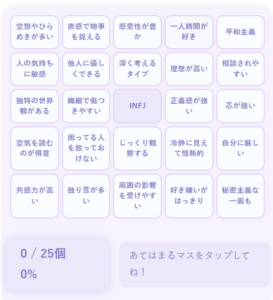 mbti-infj-bingo 2025.07.19 今すぐMBTI性格診断する 今すぐ色分け診断する 今すぐ動物診断する 今すぐビンゴ診断する 今すぐラブタイプ診断 今すぐキャラクターコード診断 姉妹サイト AI無料相談ナビ 悩みをAIにチャットで相談/匿名&ログイン不要 今すぐAI相談(無料) タイプ別あるある診断(16タイプ) 今すぐ64タイプ診断をする(無料) 全64タイプ一覧を見る 今すぐラブキャラ診断をする(無料) LoveCharacter64 全64タイプ一覧を見る