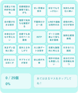 mbti-intp-love-bingo 2025.07.19 今すぐMBTI性格診断する 今すぐ色分け診断する 今すぐ動物診断する 今すぐビンゴ診断する 今すぐラブタイプ診断 今すぐキャラクターコード診断 姉妹サイト AI無料相談ナビ 悩みをAIにチャットで相談/匿名&ログイン不要 今すぐAI相談(無料) タイプ別あるある診断(16タイプ) 今すぐ64タイプ診断をする(無料) 全64タイプ一覧を見る 今すぐラブキャラ診断をする(無料) LoveCharacter64 全64タイプ一覧を見る