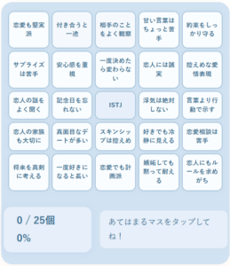 mbti-istj-love-bingo 2025.07.19 今すぐMBTI性格診断する 今すぐ色分け診断する 今すぐ動物診断する 今すぐビンゴ診断する 今すぐラブタイプ診断 今すぐキャラクターコード診断 姉妹サイト AI無料相談ナビ 悩みをAIにチャットで相談/匿名&ログイン不要 今すぐAI相談(無料) タイプ別あるある診断(16タイプ) 今すぐ64タイプ診断をする(無料) 全64タイプ一覧を見る 今すぐラブキャラ診断をする(無料) LoveCharacter64 全64タイプ一覧を見る