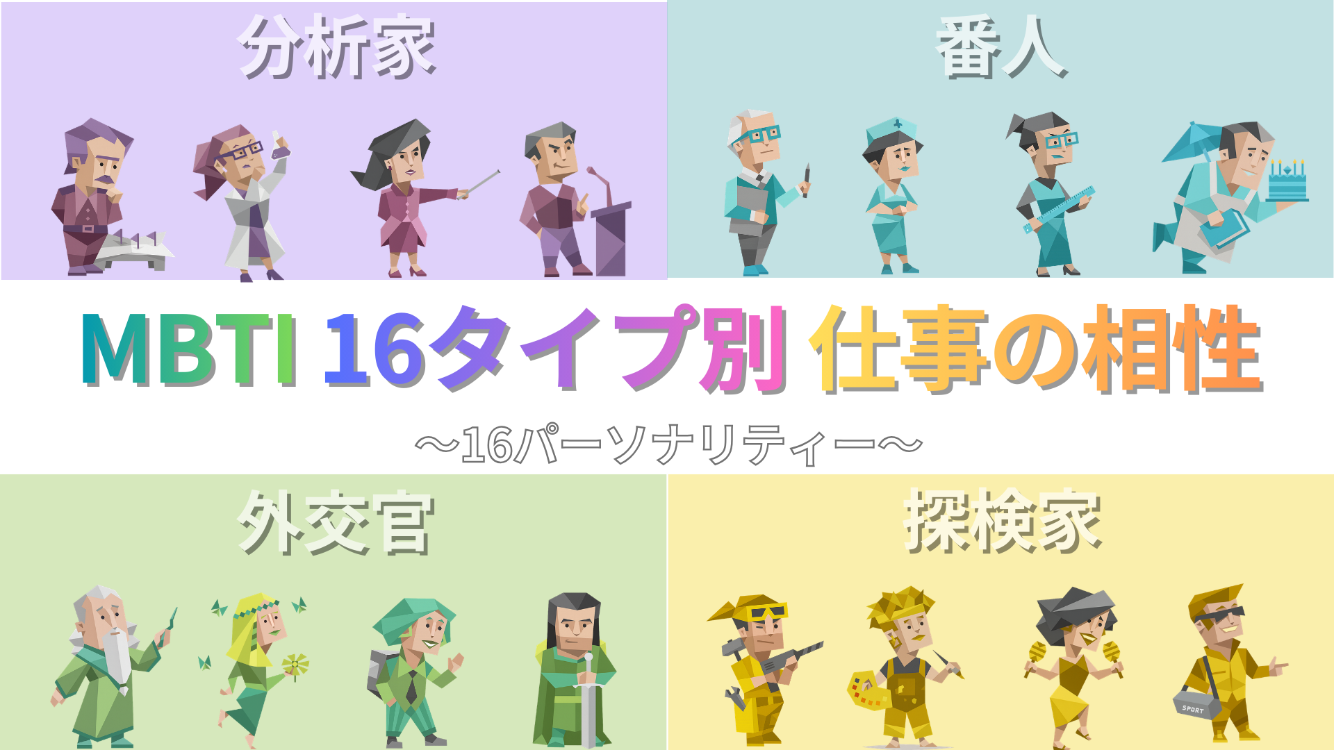 下の各タイプは、仕事の強み・つまずきやすい点を整理し、仕事の相性(MBTI)が良くなりやすい相手と摩擦が出やすい相手を“傾向”としてまとめています。